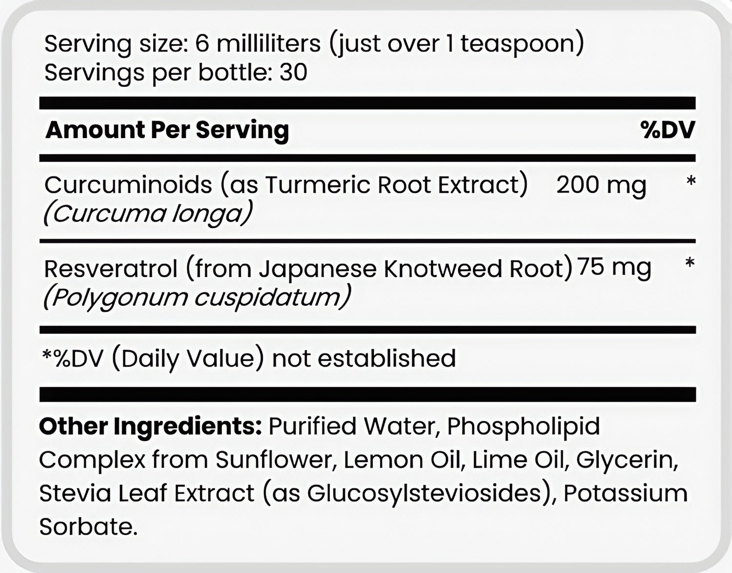 This liposomal formula delivers Curcumin and Resveratrol, two well-studied antioxidants that help support a healthy inflammatory response, promote cellular health, and protect against oxidative stress. This powerful duo supports joint function, healthy aging, and overall wellness so you can feel your best every day.*
